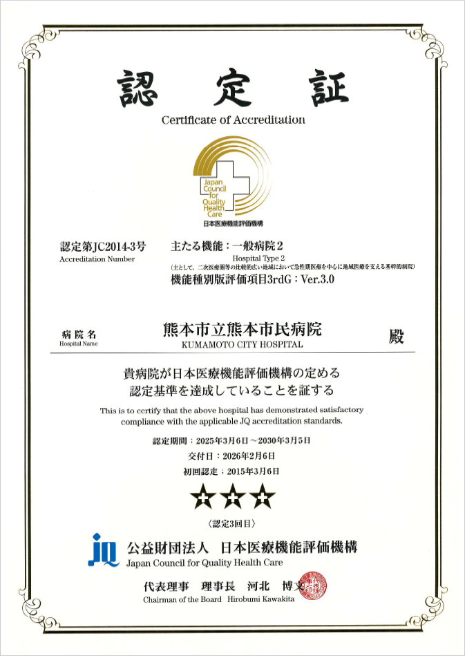 評価結果の詳細については日本医療機能評価機構Webサイトをご覧ください。今後とも、熊本市の基幹病院として、地域の医療機関等との連携を強化し、より地域に密着した患者さん本位の医療を提供してまいります。
