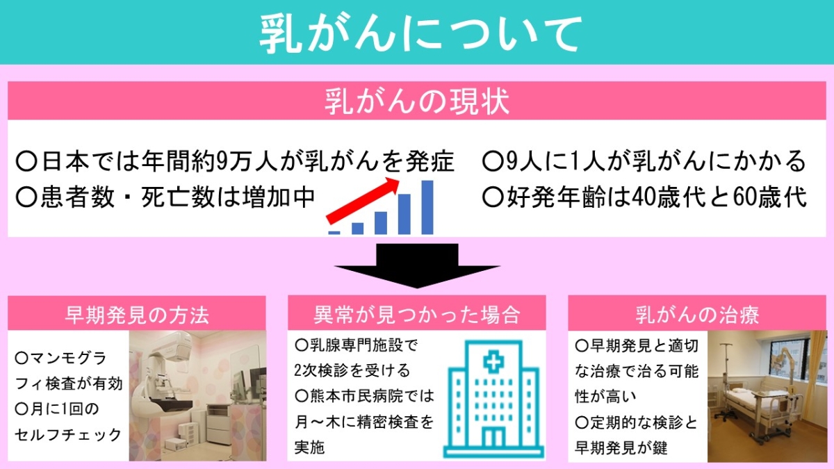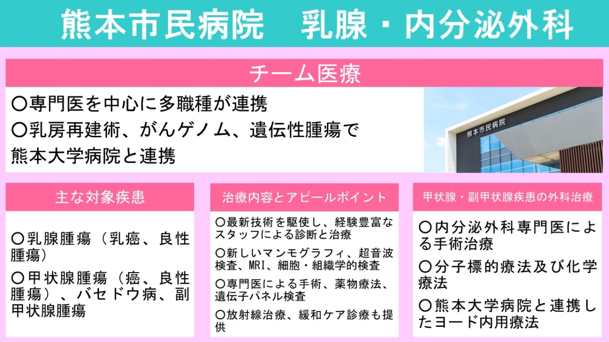 手術においては、外科医はすべて外科専門医かつ乳腺専門医の資格を持ち、多くの症例を経験しています。乳房再建術については、現時点では形成外科医が不在ですが、熊本大学病院との連携を通じて診療を行っています。