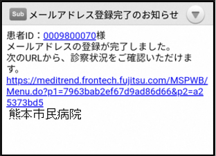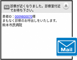 診察室に呼び込む順番の「3人前」と「1人前」になると、次のお知らせメールが届きます。